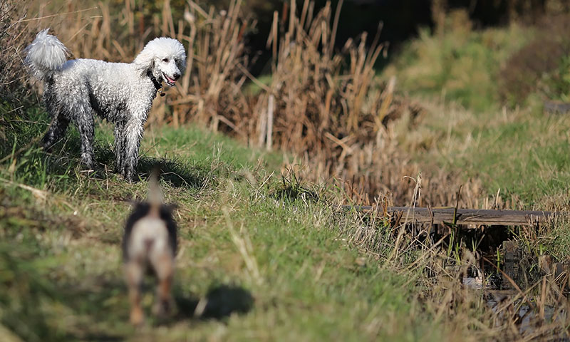 | 13.10.2013: In der letzten Woche hat Fani einen neuen Pudelfreund kennengelernt..... Lenny, ca. 7 Monate jung. Er ist viel ruhiger als sie und so mühte sie sich erst einmal, ihn zum Toben zu bewegen... mit Kaja ist sie da ja schon eingespielt....auch die Beiden haben sich in der letzten Woche wieder gesehen.... schön war's; aber leider ohne Bilder wegen iiih-Wetter....;o) Der junge Mann musste erstmal *auftauen*; aber dann haben sie auch sehr schön gespielt... diverse andere Hunde waren ebenfalls unterwegs und bei den Schnappschüssen gibt es noch mehr Bilder! |
