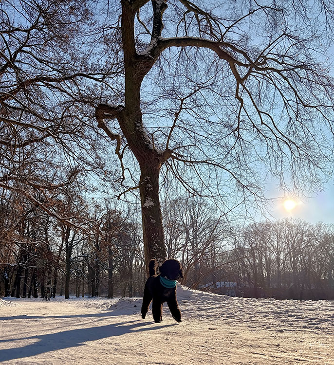 | 08.01.2026: Es ist ganz schön kalt geworden und wir haben noch mehr Schnee bekommen - Morris ist begeistert und endlich mal gut zu sehen :) Der Schnee hält ja immer so ein bißchen die Zeit an... alles ist leiser ;) |