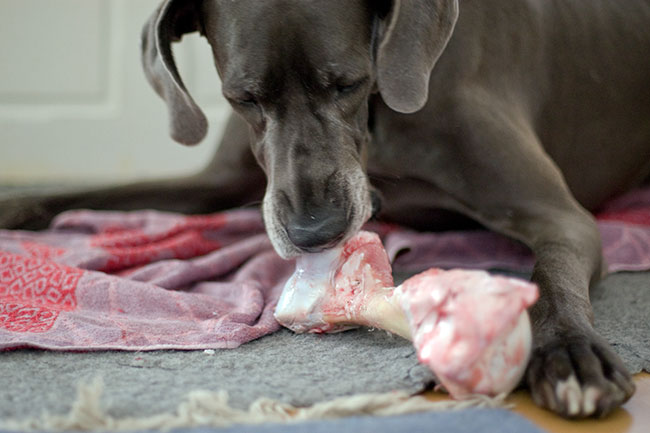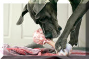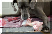 | 28.09.2007: ...und wirklich..... schon wieder Regenwetter.... da bekommt Iska zur Indoor-Beschäftigung einen feinen Kalbsknochen.....;o) Das Knochenschnurpsen macht etwas Mühe und braucht seine Zeit und außerdem werden auch gleich noch die Zähnchen schön sauber dabei.... |